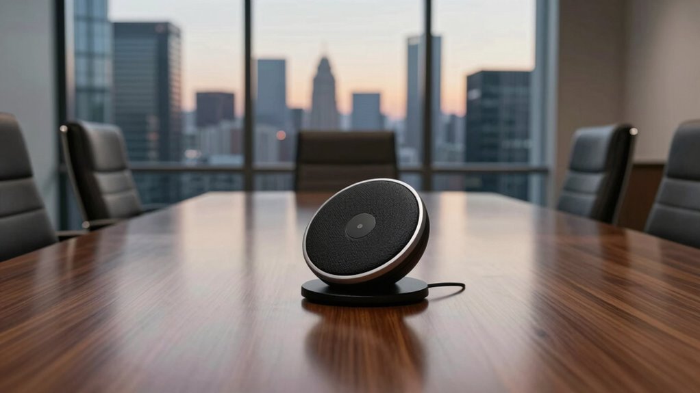 When selecting a conference speakerphone for client meetings, portability and design play a significant role in making certain smooth, on-the-go communication. A lightweight device, ideally under 300 grams, makes it easy to carry between locations without added bulk. Compact dimensions, around 5 x 5 inches, help it fit comfortably into bags or briefcases, saving space. Built-in rechargeable batteries with 10-20 hours of usage support all-day meetings without frequent recharging, keeping you prepared. A sleek, professional look with minimal buttons enhances usability and guarantees the device looks suitable in various settings. Additionally, compatibility with carrying cases or protective covers boosts portability and protects the device during transit, making it a practical choice for frequent travelers and mobile professionals.