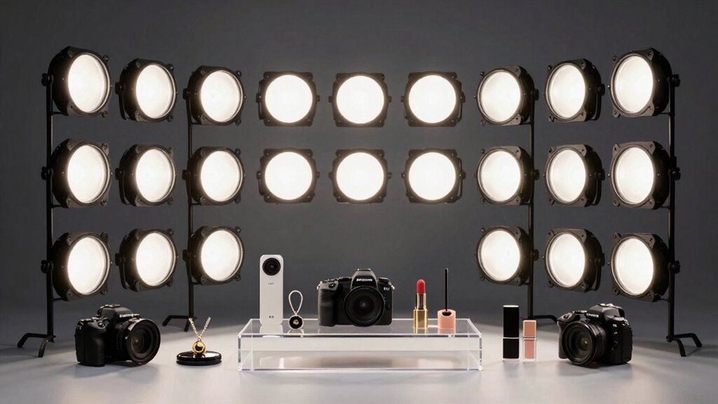 High CRI (Color Rendering Index) values are crucial when selecting LED video lights for product photography because they guarantee that colors appear natural and vibrant. A CRI of 95+ ensures accurate color reproduction, making products look appealing and true to life. Lights with lower CRI, below 90, risk causing color distortions that can make items appear dull or inaccurate, affecting overall image quality. Consistently high CRI helps capture fine details, textures, and true hues, which are indispensable for commercial product shots. Additionally, choosing LED lights with adjustable color temperature alongside high CRI provides greater control over mood and color accuracy, enabling me to adapt to different shooting environments effortlessly. This combination ensures my product images are both vibrant and true to life.