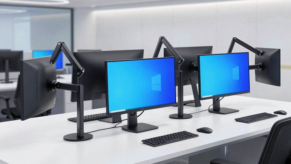 High-quality monitor arms are built from durable materials like aircraft-grade aluminum or reinforced steel, which are essential for withstanding daily use in busy agency environments. These materials guarantee the arms can support monitors weighing up to 40 pounds or more, thanks to reinforced VESA plates and thickened arms. Extensive testing, such as supporting over 50,000 cycle motions, guarantees long-term durability without sagging or wobbling. Well-designed arms also feature sturdy mounting bases, like heavy-duty clamps or grommet mounts, that securely attach to desks up to 3.5 inches thick. The materials and construction quality directly impact the stability and lifespan of the monitor arm. Investing in a robust build ensures reliable performance in demanding workspaces, reducing replacements and maintenance costs over time.
