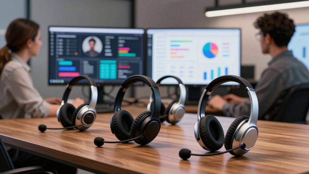 These wireless headsets are highly compatible across various communication platforms like Zoom, Microsoft Teams, and Skype. I’ve found that most models support multiple devices seamlessly, with easy switching options. They’re designed to work with both Windows and Mac systems, plus mobile devices. This flexibility guarantees I can stay connected no matter what platform my team uses, making remote collaboration smooth and hassle-free.