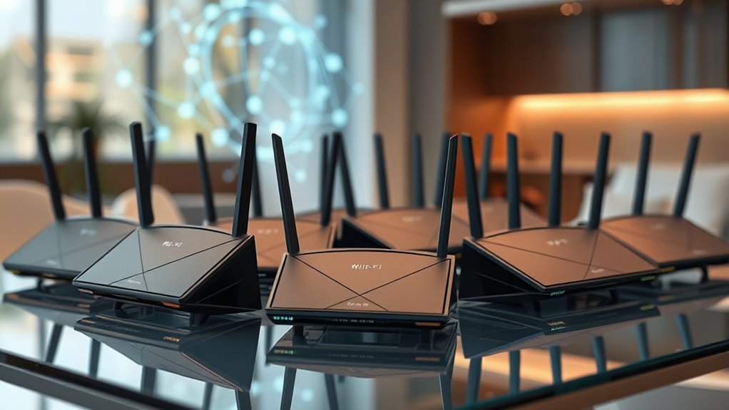 Coverage is a critical factor to contemplate when choosing a Wi-Fi 6E router, as it determines how well your network reaches every corner of your home. Thanks to advanced antenna designs and beamforming technology, Wi-Fi 6E routers offer broader coverage and more stable connections over larger areas. The use of the 6 GHz band reduces interference, providing more consistent coverage across multiple rooms and floors. Higher gain antennas and multiple spatial streams boost signal strength and extend range, making it easier to cover extensive layouts and multi-room setups. Additionally, mesh compatibility allows you to expand coverage seamlessly by adding more units without sacrificing performance. Proper placement, like positioning the router high and unobstructed, is essential to maximize coverage and prevent dead zones.