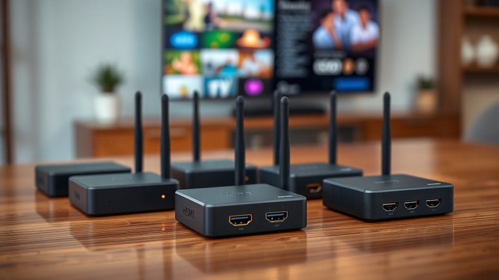 Wireless HDMI transmitters aren’t universally compatible with all smart TVs, so I always double-check before buying. Most work with HDMI-enabled TVs, but some older models or smart TVs with specific port configurations might need adapters or might not support the technology at all. I recommend reviewing your TV’s specifications and the transmitter’s compatibility list to guarantee seamless streaming without any hiccups.