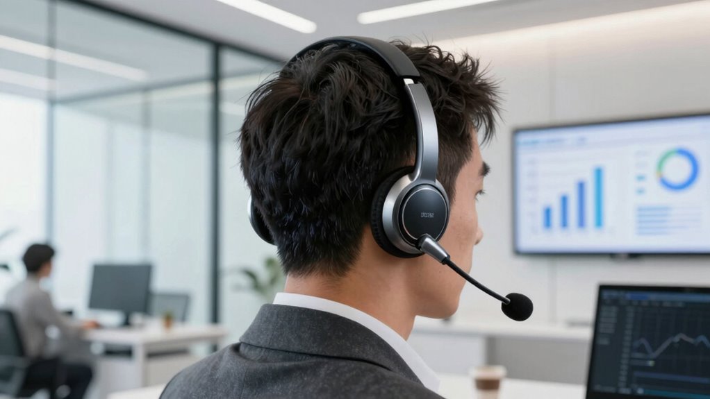 Noise cancellation features play a crucial role in ensuring your sales demos come across clearly, even in noisy environments. Effective noise cancellation technology can block up to 99% of background noise, making sure your voice is heard without distractions. Active noise-canceling microphones use advanced algorithms to filter ambient sounds, which is especially helpful during remote presentations. If you often work in busy offices or trade shows, consider headsets with environmental noise suppression to cut down on distractions. Dual-mic systems with noise reduction improve voice clarity and reduce echo, ensuring prospects understand your pitch. High-quality noise cancellation isn’t just about sound—it’s about presenting professionally and staying focused during critical demos and virtual meetings. It’s a key factor in choosing the right headset for sales success.