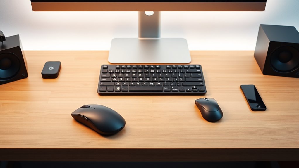 They say, “Small spaces demand smart solutions,” and I couldn’t agree more. For limited desk space, I recommend compact wireless combos like the Logitech MX Keys Mini with MX Master 3 or the Microsoft Designer Compact Keyboard and Mouse. These sets save space without sacrificing performance, helping you stay organized and efficient. They’re perfect for squeezing into tight spots while keeping your workflow smooth and uninterrupted.